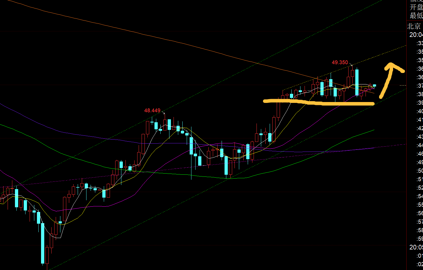 白银方面:日线也是大阳,已站上10均线48.6,测试中轨压力49.4; 而日内处于高位持续横盘整理,48.65低点守住,则继续看好向上突破,一旦拿下49.4,上方空间就会逐步打开,次高点按618就会指向51一线;