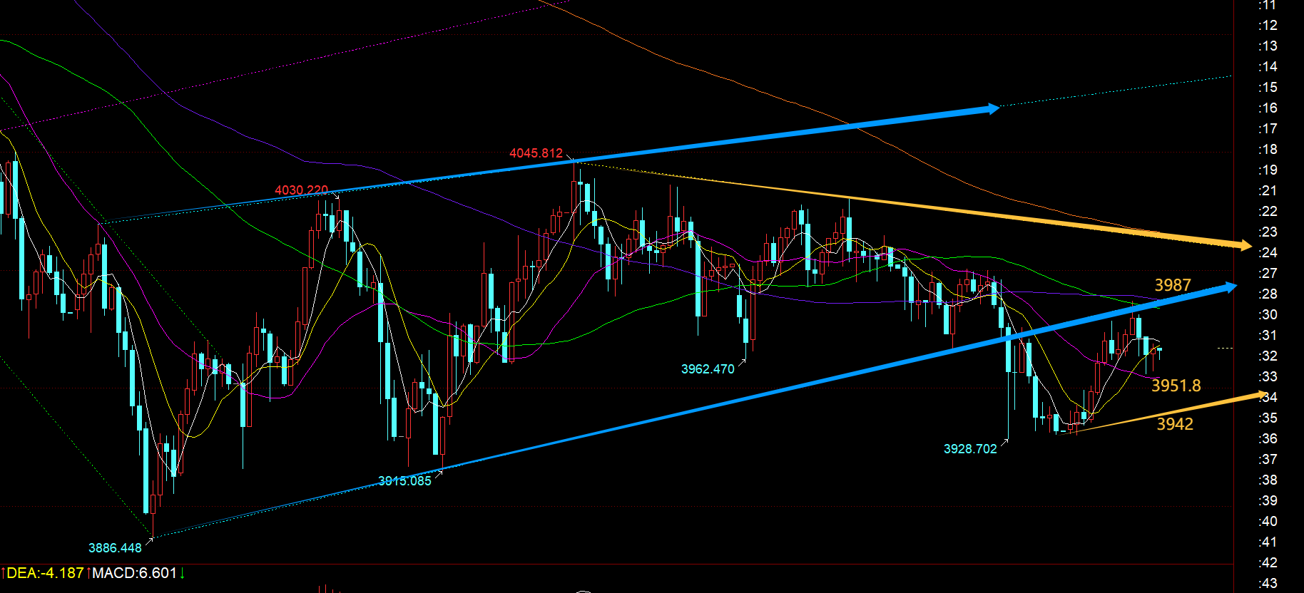 第三,黄金小时线级别:隔夜弱势连跌收盘于低位,而今日早间8点之前并未出现一波循环急跌,那么先震荡反弹一波,就可以依托382分割阻力3950一线先跟随看跌,抵达3934位置出现企稳拉升,11点收报大阳再回到3950,就意味着要走震荡反复去修复昨晚的跌幅;等欧盘触及上图蓝色收敛通道的下轨反压点3985时,刚好也是66日均线承压点,共振于日线5日承压位,因此提前埋伏此处看压制回落,欧盘也是成功打压至靠近中轨位置;此时基本没啥动静,市场在静心等待今晚ADP小非农数据的刺激,因为上月此数据是悬空的,这次公布可能会带来不小的波动,也是作为周五大非农数据的前身参考;以3930-3987这一波分割来看,下方留意618支撑3951.8,以及786支撑3942,中轨位置其实也是靠拢618的 ,阻力3973、3987,先围绕支撑和阻力之间的继续震荡整理,尽量卡两边相对极端的位置;