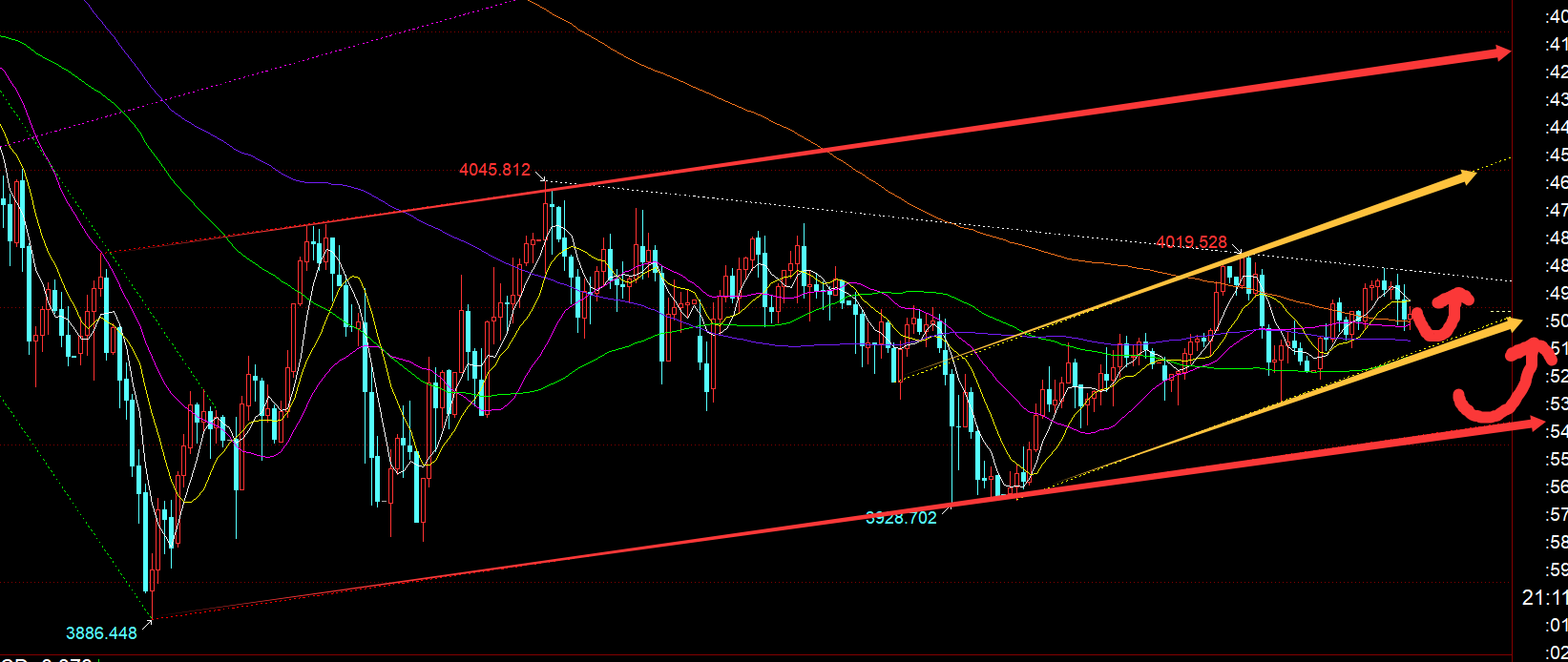第一,黄金方面:昨日从3965一路拉升至4020一线,走的比较偏强,有些小单边,但美盘并未跟随二次上涨,反而向下洗盘又跌回3965低点;从分割角度看,3965刚好是3930-4020的618处,半夜触及企稳出长下影K,意味着打压低点出现;反弹至小时线中轨再回落企稳于3975,此处是50分割位置,今日早间直接起拉,大阳出现,则回踩382处支撑3985上就是一个支撑,企稳再次震荡拉升,目前冲击4000之上;其实昨晚黄金为啥会大洗盘,回过头来一看美股,果然受到它影响,流动站紧缺;
