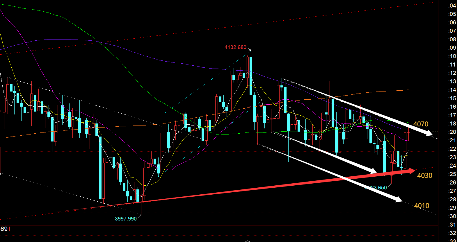 然后4小时级别的年均线支撑依然存在,也出现了多次插针下影; 从小时线级别看,亚盘承压图中白色通道上轨4087一线冲高回落,这点在后半夜早已计划提示;欧盘延续承压跌至最低4023, 两次进行插针,刺穿红色通道下轨,然后运行于4030-4070范围内震荡一下午;今晚来讲,重点留意白色通道上轨,下移至4070一线,也是前一个小时快速拉升的高位,这里承压不上,则继续会震荡于4070-4030区间,若压制下行,支撑关注4046-40,它是大阳回踩的618分割处,其次是4030上,企稳震荡看涨,极限是日线收敛三角下轨支撑进行插针的话,留意4010一线位置的企稳; 另外,若小时线收盘站上4070有效了,那么弱势震荡会转为偏强震荡,上方可能又会反复去试探4100关口;
