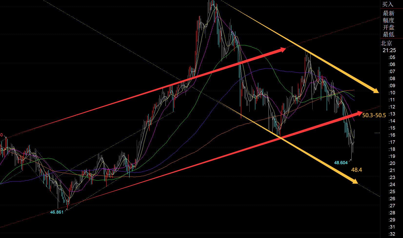 白银方面:白银今日反而比黄金弱很多,亚欧盘持续连阴慢跌,几乎无反弹,直接进行日线级别趋势支撑线的插针,最低48.6,逼近周线10均线支撑48.4; 那么就要看尾盘的收线情况,若能长下影出现,收盘于49.35之上,那么还算乐观;不过本周原本看的五浪拉升基本失败,宽幅整理中对待;高位大区间关注54.4-47.5; 今晚关注红色通道下轨反压50.2-50.3,承压注意回落,支撑48.4-48.6;若重新回到红色通道内,那么下周初会回归震荡上行可能,不再太弱;