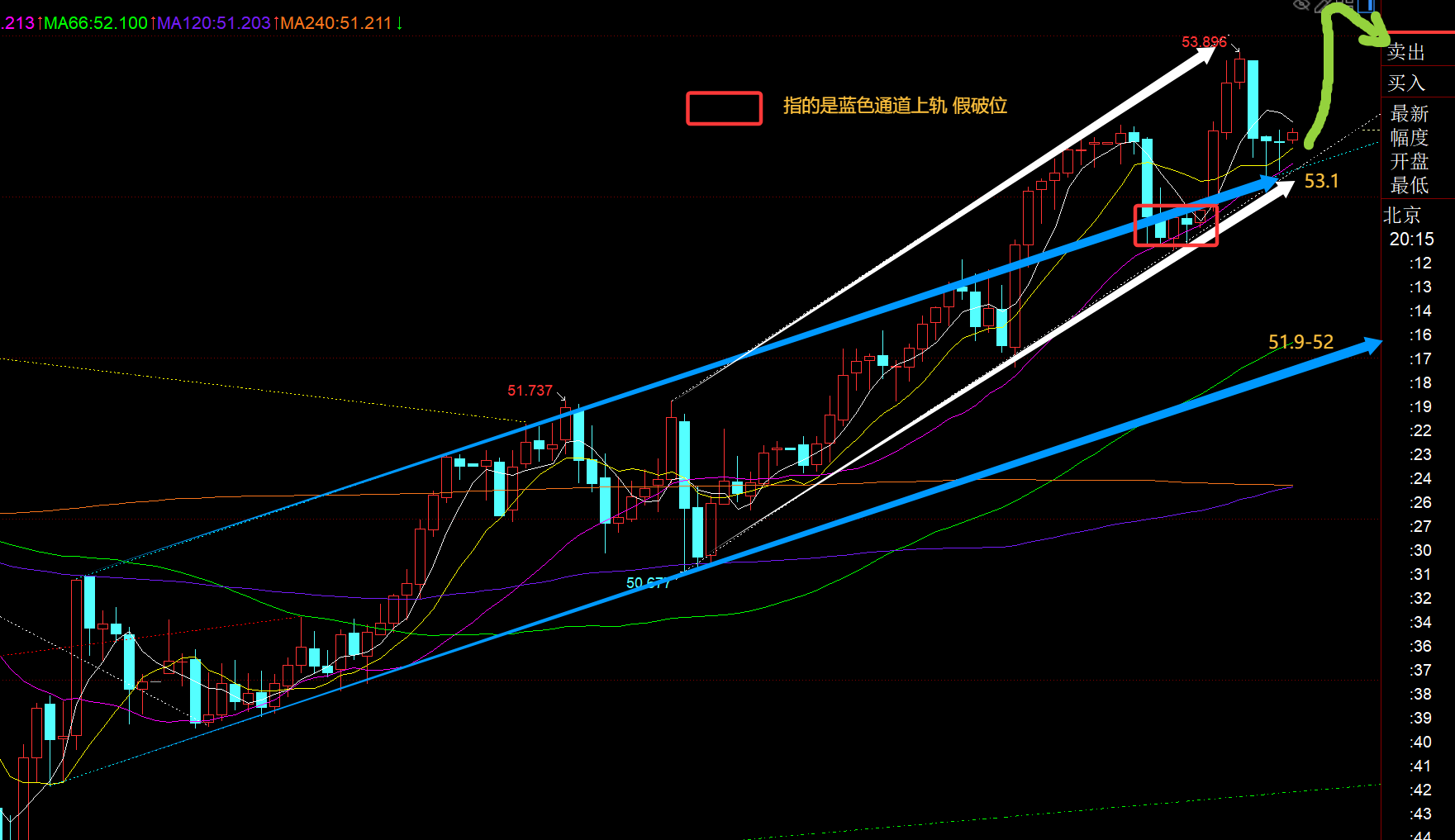 白银方面:由于市场再次发生挤兑,库存不断急缺告急,刺激白银再次强势走高,昨日收报大阳,今日延续拉升;从上图通道分布看,今晚重点支撑是53.1上,小时线中轨,也是蓝色通道上轨和白色通道下轨共振重合点,守住53.1,则今晚继续偏强拉升,去试探白色通道上轨,基本指向靠拢54.4历史双顶阻力位; 假若53.1被跌破有效失守,那么白银这波强势暂缓,步入震荡回调修正;