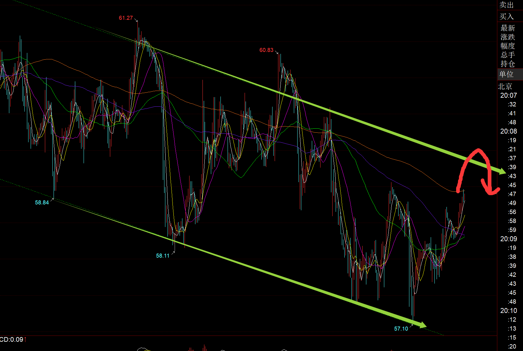 原油方面: 继续围绕一个月以来的通道震荡运行,下轨57附近提示企稳后,逐步再次去靠拢上轨,阻力下移59.3一线,触及承压或可能会向上先突破来一个诱多,等它再打压回到通道之内承压后,再去看压制下跌即可,这个通道上下轨范围大概保持250点左右范围;