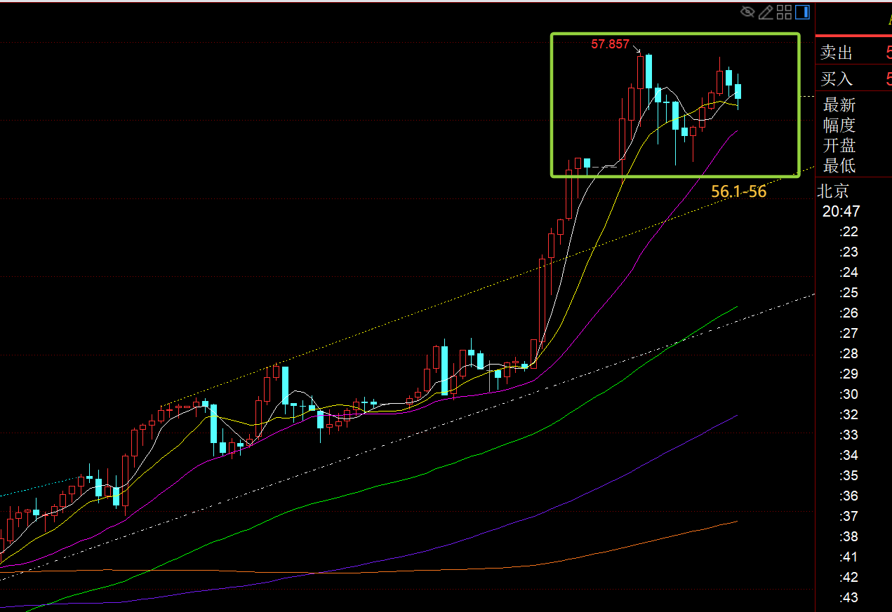 白银方面:日线上周五大阳,那么后续回踩确认的支撑就是前面双顶的顶底位置54.4-54.3一线,而当前价格还有些距离,所以还需要时间来等待,高位也不太好追涨,虽然趋势的确很强,但强扭的瓜的确不甜,该放弃还是得放弃, 前期相对中长期较低位的底仓看涨的就耐心持有,长线下一个可以等66; 今晚暂时也是高位整理,阻力57.8,支撑56.1附近;若失守56.1回归黄色通道之内的话,那么日线就可能出现承压K,明后天就有希望回踩确认54.4-54.3,届时拉低确认再继续趋势看涨,越低越要敢于分批尝试; 因为,黄金处于高位收敛三角整理,而白银它的确很有可能已经处于牛市趋势回归当中;