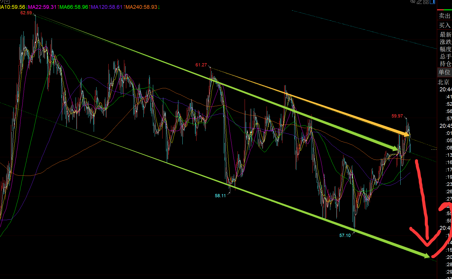 原油方面:这次的通道上轨承压虽然墨迹些,复杂些,同样也应该只是向上击穿诱多而已,一旦重新回到绿色通道之内,则继续看下轨支撑56.5一线;