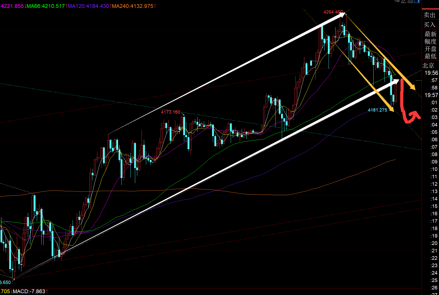 第三,黄金小时线级别:从上图看,今天亚欧盘走了一路的震荡慢跌,白色通道下轨支撑4200上并未双底守住,连阴下破,那么今晚还有二次打压可能;而此时的美盘前反弹是作为诱多来对待,参考蓝色下滑通道上轨,以及66日均线,关键压力集中4210附近,原本4203顶底应该也有些阻力,但目前没反应;下方支撑留意4173-70黄色通道下轨,也是前期的顶底位置;若再往下打压厉害些,就可能直接去试探日线10均线4144,或此周期的年均线4132,也是50分割位置,这里应该存在支撑反弹作用;当然,假若小概率发生洗盘,又突破站上了黄色通道上轨,那么又是来回的多空杀,这种遇到了也要承受,毕竟我们做的是都是技术性常规的规律走法,各自的交易体系;