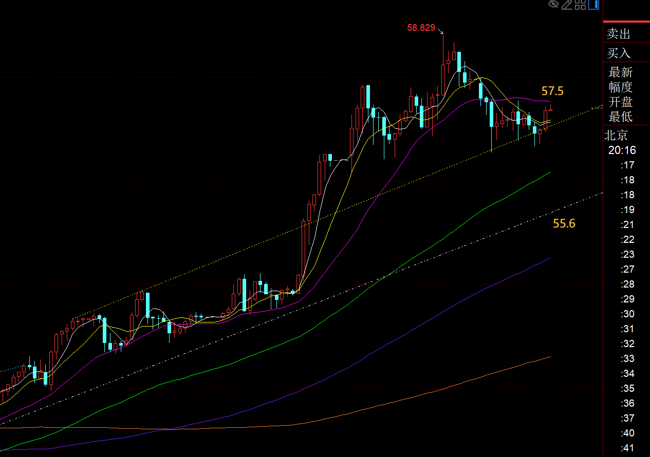第二,白银方面:昨日依旧表现很强,继续刷了历史新高,逼近58.8,由于这几日它的波动率实在太大,动不动就是1块钱上,对于短线卡小止损难度就很大,必须精准入场点才能规避刺破;若放开些止损,由于它本身盈亏比大,也不太合适;因此,基本多看戏为主;