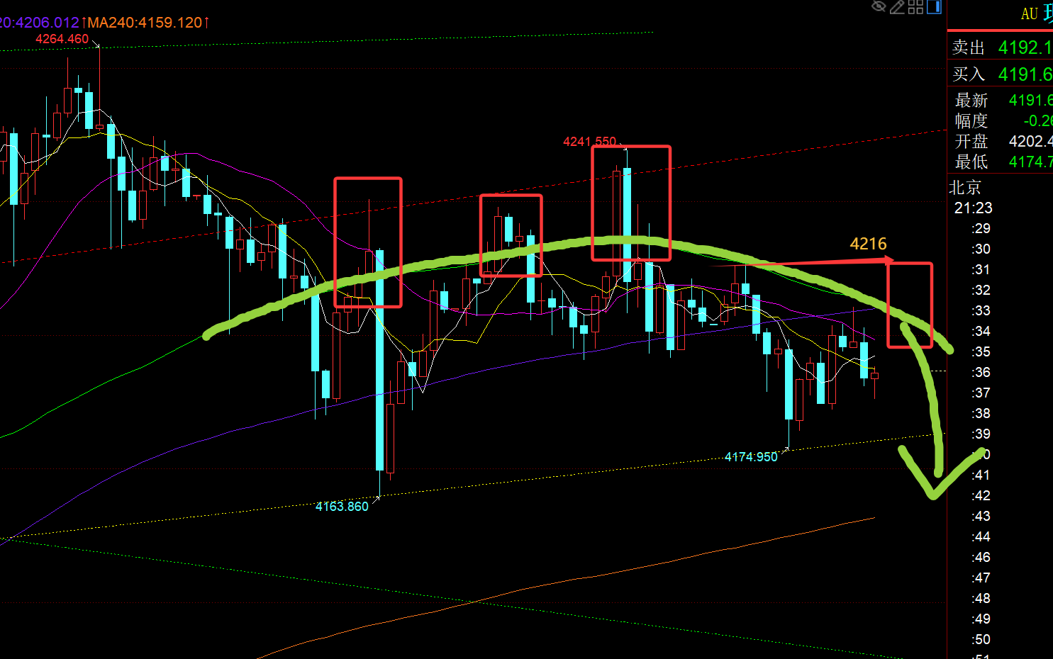 第二,黄金小时线级别:早间反弹承压4216,并未试探隔夜跌幅的618分割阻力点,午后也直接失守了隔夜横盘支撑4194,最低打到4175,离预期埋伏点4173略差2米,这周已经是多少次踏空了;面对震荡行情,节奏和运气都重要,两者满足不了,做起来就非常被动,不是踏空错过,就是被洗;上周就是节奏和运气两者都完美把握住了,做起来才顺风顺水;只能继续找节奏,多等待;4216跌至4175这一波之后,欧盘指出反弹618分割阻力4200一线是关键压制点,也是中轨处,反而市场又作妖了,就是不给顺畅,先刺破了4200,打到4206,下来之后又墨迹了一个小时徘徊于4200-4195就是死活不跌,然后等调仓之后,它就顺溜溜的跌至4185,气人不;