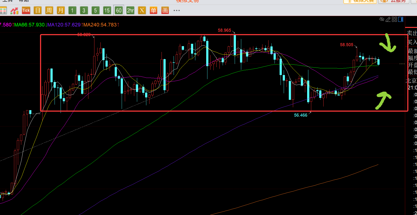 白银方面:白银从原先的单边强势拉升,也逐步开始高位的箱体横盘整理,上方58.9下阻力,下方56.5上支撑;中途就关注小时线中轨57.5,靠边看震荡来回;只有失守56.5节点位置,日线才能调整一波,后市才能给到相对低位趋势看涨,或者补仓的机会;
