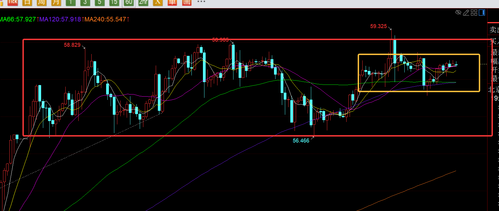 白银方面:日线处于单边趋势格局中,日内显得就相对抗跌;不过一波拉升之后,几日都处于相对高位区间56.5-59反复整理,也要谨防什么时候突袭下调; 今日还是留意红色框区间,小区间是黄色框,阻力58.7-59,支撑57.5、56.5,暂时区间内整理;