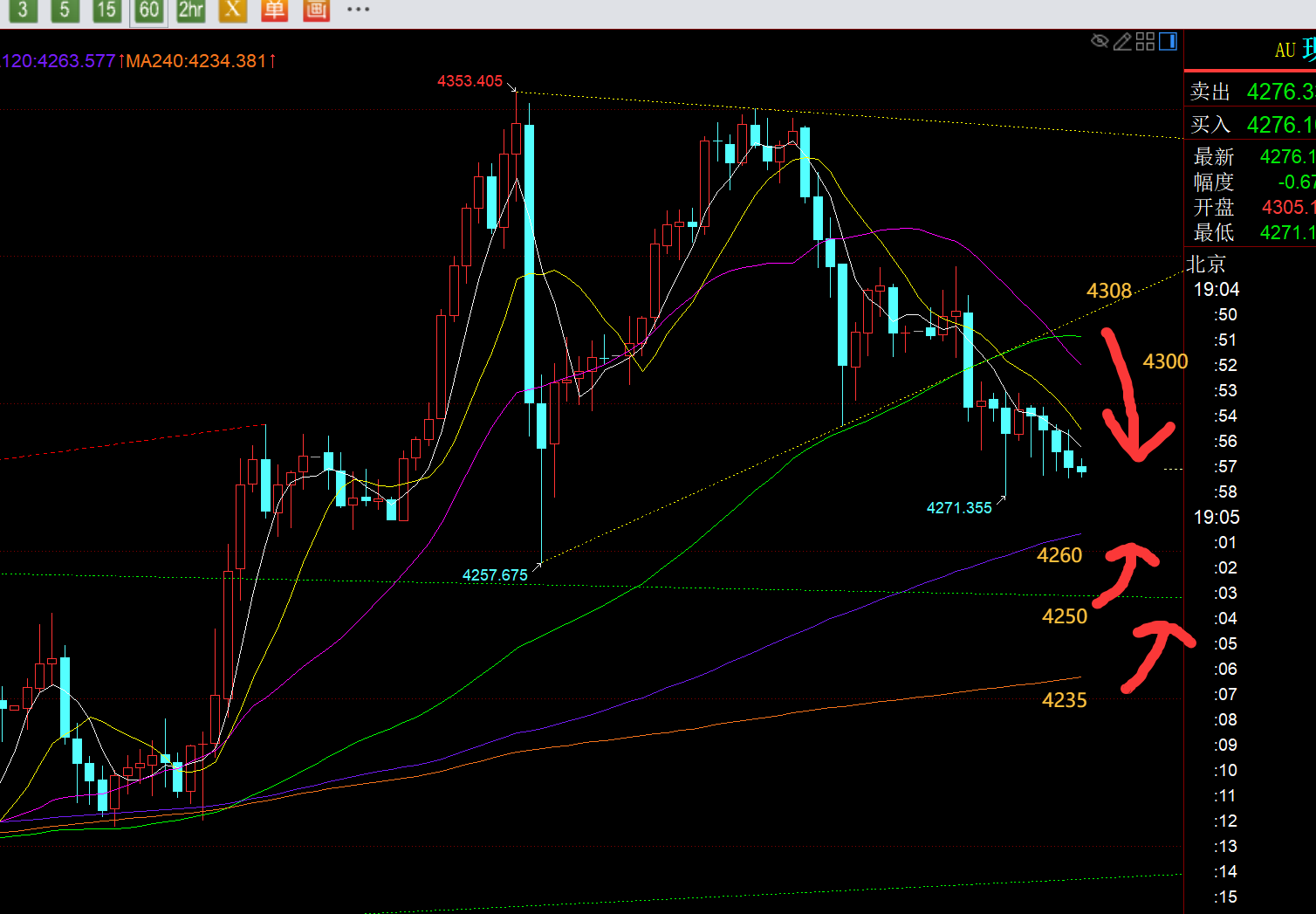 第三,黄金小时线级别:早间先依托4300一线企稳反弹了一波至4318一线,刚好承压凌晨阻力位,也未突破中轨,冲高回落之后,失守4257-4285趋势支撑点4297,则意味着要震荡走弱一波,只是比预期还弱一些,因为并未先反弹确认趋势反压点4302,也是当时跌幅的618分割处;那么整个欧盘动静不大,但可以发现也是一直连阴,阳线都不好出,说明弱势格局,被压制的很死,今晚势必还有新低出现;同时,短周期macd也在酝酿双底背离,因此综合来看,亚欧盘弱势下跌,美盘会有二次打压,若先直接续跌一波,则应该容易出现一波超跌反弹,借助背离上拉,下方支撑留意4260-4250区域企稳,强支撑4235,刚好也是年均线; 若先诱多反弹一波,则只要无法突破站上中轨阻力4300一线,刚好也是目前日内高低点的618阻力,那么是容易冲高二次打压的,极限反弹阻力就是图中黄色趋势反压点4308下;言外之意就是今晚只有重新突破站稳了中轨,才能从弱势震荡转为偏强震荡;