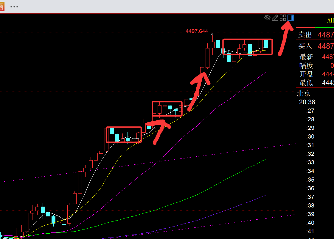 第一,黄金方面:昨日早间开盘直接发力上涨,未触及周末指出的4332小时线中轨看涨点,一路连阳逼空突破4350、4381两关口,冲击4400之上,也正式步入了牛市第二阶段-----日线连阳强势拉升,因为它破了前历史高点;亚盘走高后,欧盘回踩始终给不到相对好的顶底支撑低位,因此对于美盘来讲,方向肯定是明确的,就是往上走,无非是稳健和激进做派,激进的则不等太多回踩,直接入局看涨,目标4442最终也是到位的;