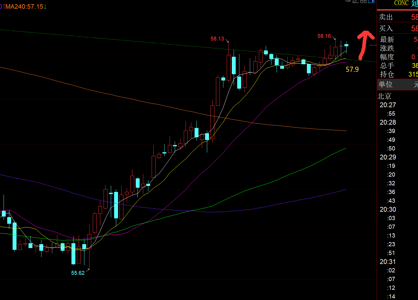 原油方面:从当前通道来看,上轨有所横盘突破,那么今晚留意57.9,也是小时线中轨,稳住它,则倾向于进一步反弹拉升,阻力留意日线66日 59.6;
