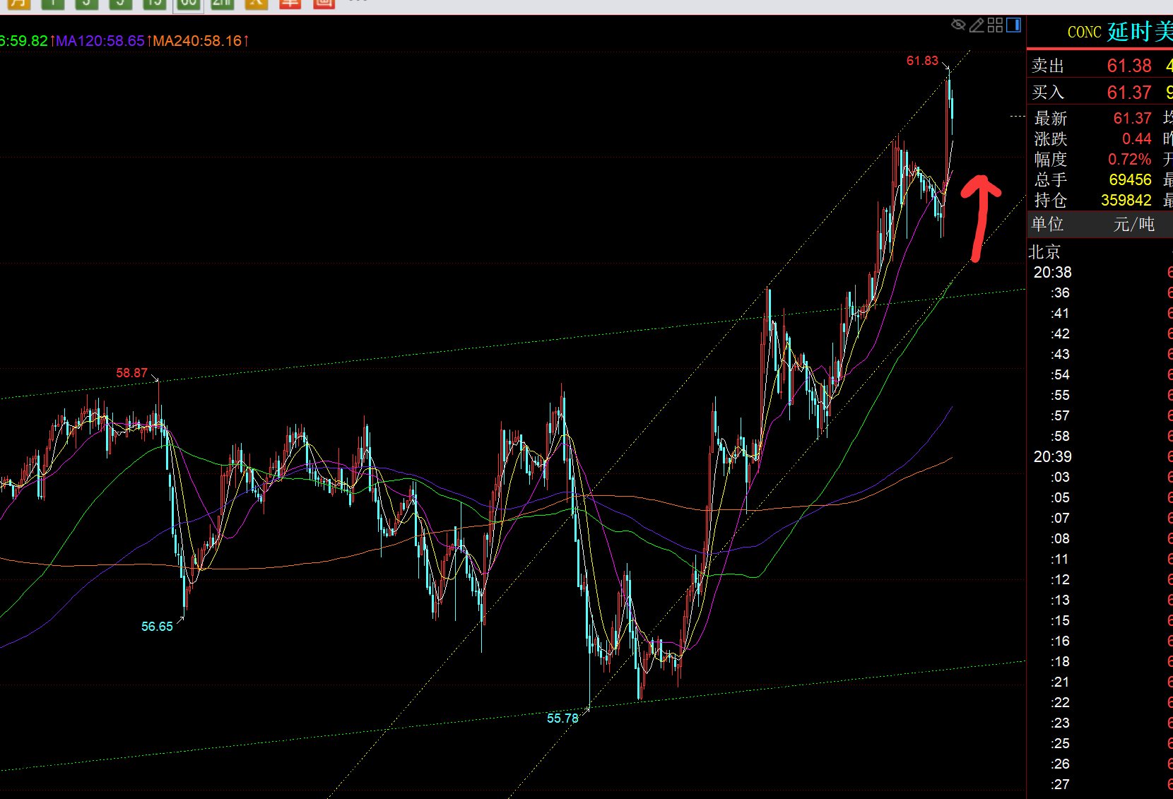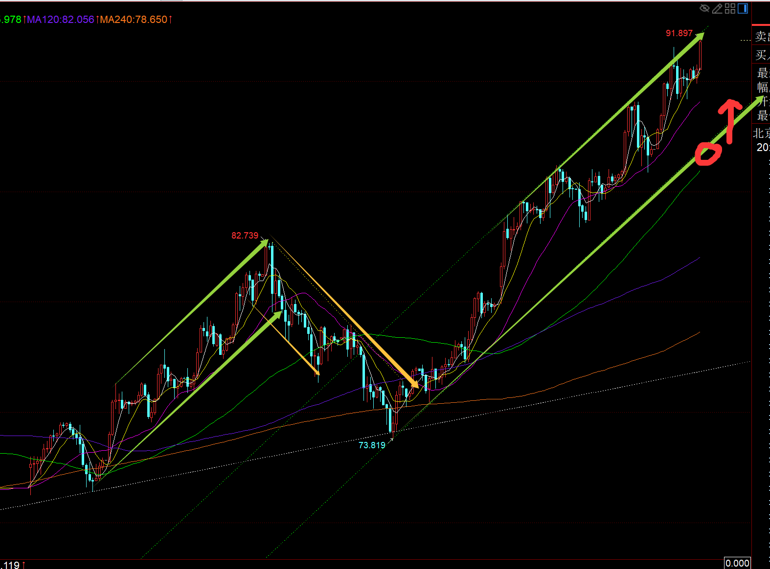 第二,白银方面:北上之路继续坚持,前两周70波段北上,74波段北上,这周85、86陆续继续波段北上,一路单边拉升走高,今日最高快逼近92一线;
