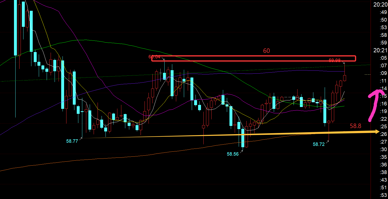 原油方面:今日再次依托日线前期通道上轨回踩支撑反弹拉升一波,58.8一线底部箱体支撑,60一线是当前箱体阻力,今晚留意区间内运行,要突破站上60,才能进一步延续反弹,今晚回踩59.2及下继续北上看反弹;