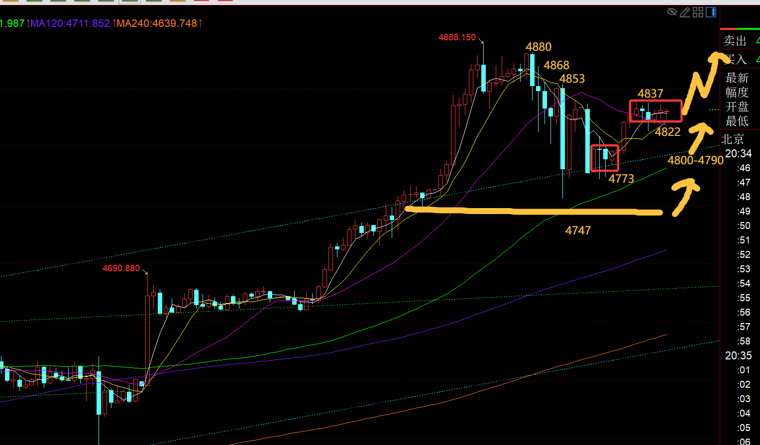 第一,黄金日线级别:日线三连阳强势上冲后,今日先向下修正一波,最低4771一线,再探底拉升,这也算是进行了针对前三天涨幅的修复过程;而目前突破前期通道上轨之后,已经有所步入单边强势上拉,作为单边走法,中途出阴或小阴小阳K都属于修正,很容易后续继续企稳上攻刷历史新高;所以,继续保持大趋势北上,先依托5均线之上跟随即可;