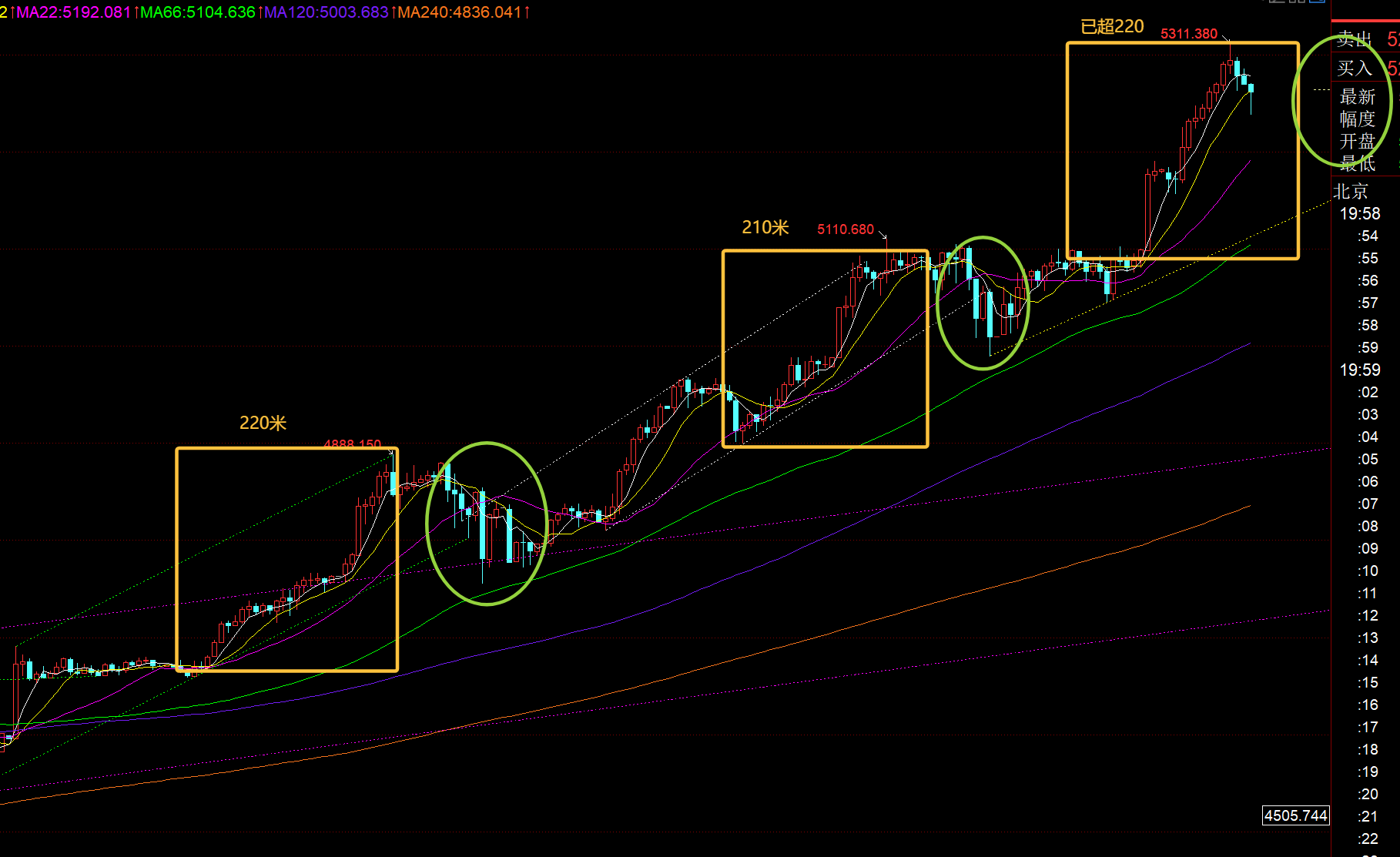 第一,黄金方面:上图是小时线走势,可以看出一些规律,黄色框属于这几日每一波的持续涨幅,大概平均220米;而绿色圈属于震荡回调,回踩的低点基本是黄色框涨幅回调的50%和61.8%之间;而这次涨幅早已过220米(5046低点来算),若今夜还能继续强拉破新高,那么按5157低点来算,那么220涨幅,对应的高点是5377左右;所以要看今夜老包讲话之前,是否维持相对高位整理,还是继续上攻; 那么若按5046低点来算,5311高点附近能横盘压制的话,那么今夜按规律回调的位置大概锁定5150-5170范围,先尝试看这种,毕竟今日已经涨幅160米,再往上强拉难度也有所偏大,看能否高位步入一个区间内横盘,来等待后半夜美联储利率公布消息,市场预期是不降息,重点看老包能否给惊喜,给市场泼一下冷水,降降温; 当然近一点的支撑,就是今日涨幅回踩的几个分割位置,比如50%5234、61.8%5216,而5216预计也会逐步靠拢小时线中轨,它是此周期强弱的标志,若有效失守中轨的话,那么就意味着调整会扩大;强支撑则是日线5均线,大概5050-5070范围,触及也是不错北上位置,适合波段;
