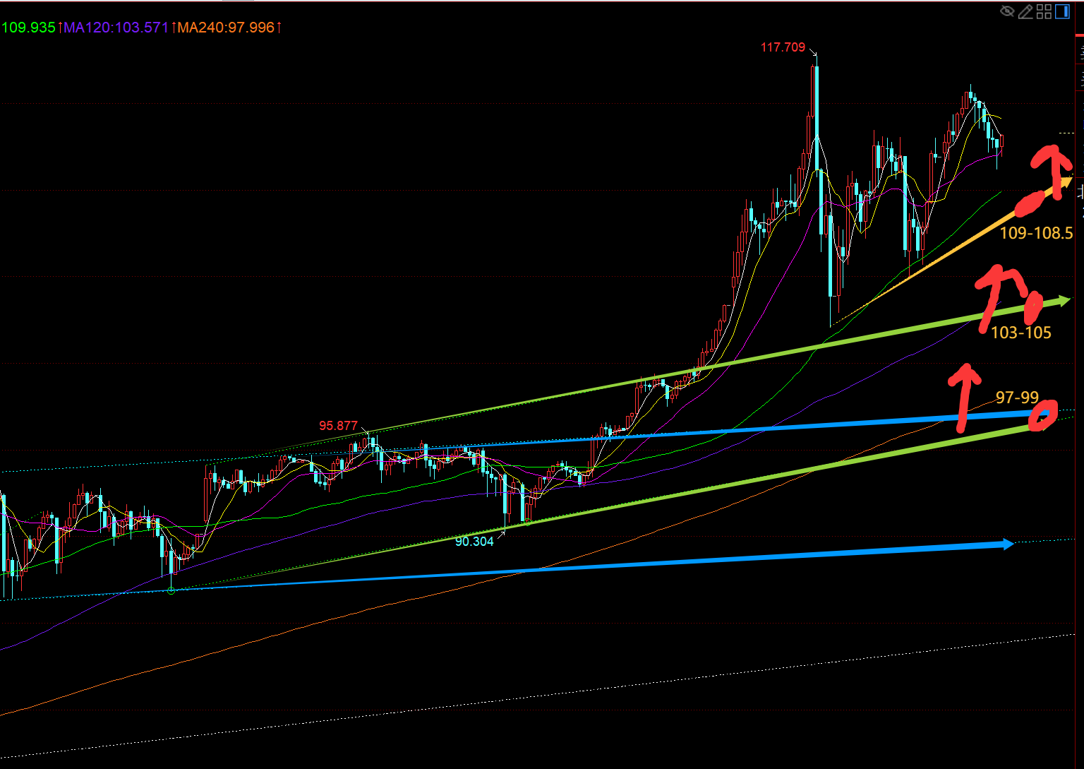 第二,白银方面:它作为波段北上来参考,相对好的位置仍是日线5日、10日两处,分别今日对应105-103、99-97,之所以会有区域,而不是一个点,是因为波动率太大了,若价格下压,支撑也是会有所下移变动的,而不是固定一个点,黄金也是如此; 短线支撑是108.5-109; 可以发现,黄金今天持续拉升破高,而白银已经有所滞涨,所以若今夜跳水调整,它下跌力度会大于黄金,也是针对金银比的反弹修复,因为它已经到了45-43,周视频之前提及,金银比持续下跌至几个位置都可能出现反弹,一个是45-43,下一个是39和31-30,最终结束下滑而底部稳定转上行,届时就是白银补涨结束的一刻;所以,今夜还是希望,它能有所下调,给相对支撑低位上车的机会;