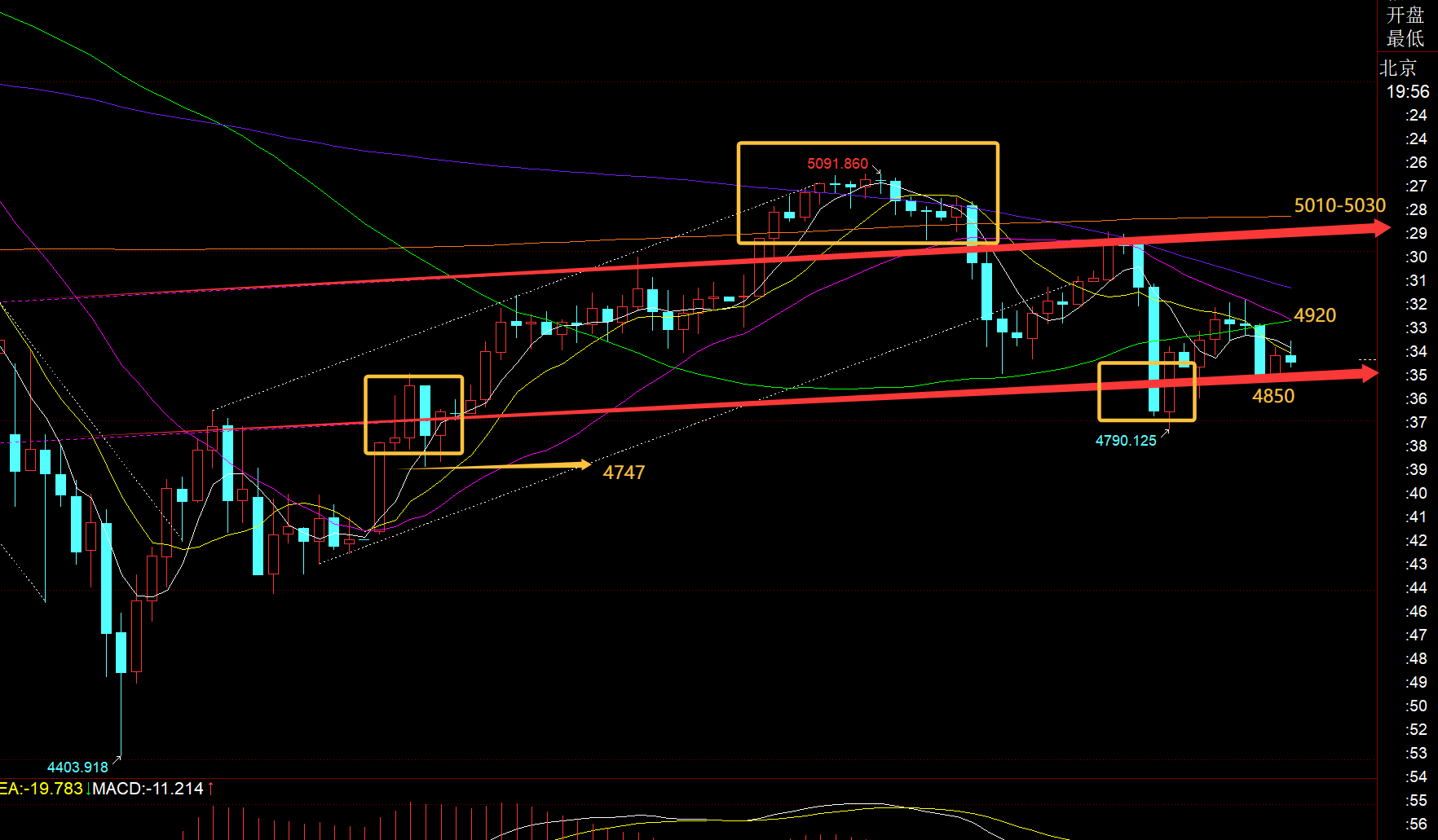 第二,黄金小时线级别:今日早间先延续凌晨反弹,拉升至5023,承压后出现200米的回测,最低4790;从图中分布看,还是围绕红色通道上下轨来看,昨日突破上轨,但没持续太久,美盘再打回通道内,然后下轨支撑,今日反弹承压至上轨再回落,4790也只是击穿,由于基数过大,刹不住车所导致的惯性,4850-4855是目前通道下轨支撑(此位置试探多次,支撑会薄弱),然后高点也在逐步下移,中轨下移4920附近, 今晚需留意的支撑得下移至4747附近,刺破日内低点之后借助背离反弹,关键阻力是小时线中轨4920-10(突破站上它,才能再测试5000的上方),看它们有效得失,惯性的存在,时不时会搞击穿假象,所以还是看收线为准;