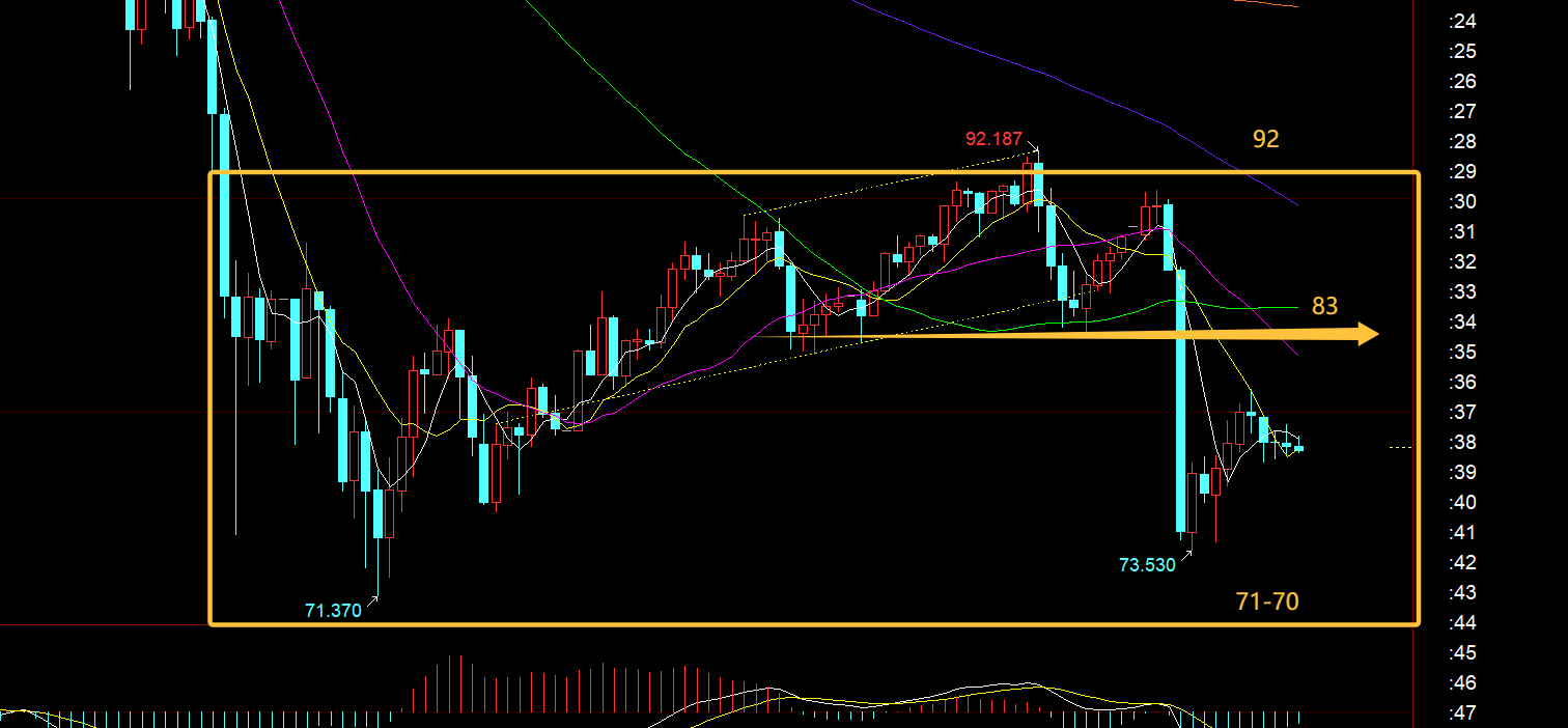 白银方面:今日从92下直接猛打压至73附近,在没有出现逼仓前,白银的走势基本都会弱于黄金,涨起来慢,跌起来快,修复金银比;当前底部整理的区间暂时锁定92-70之间;今晚若下探,再出现小时线低位长下影反阳K,则代表企稳,顶底阻力83附近也需留意下;