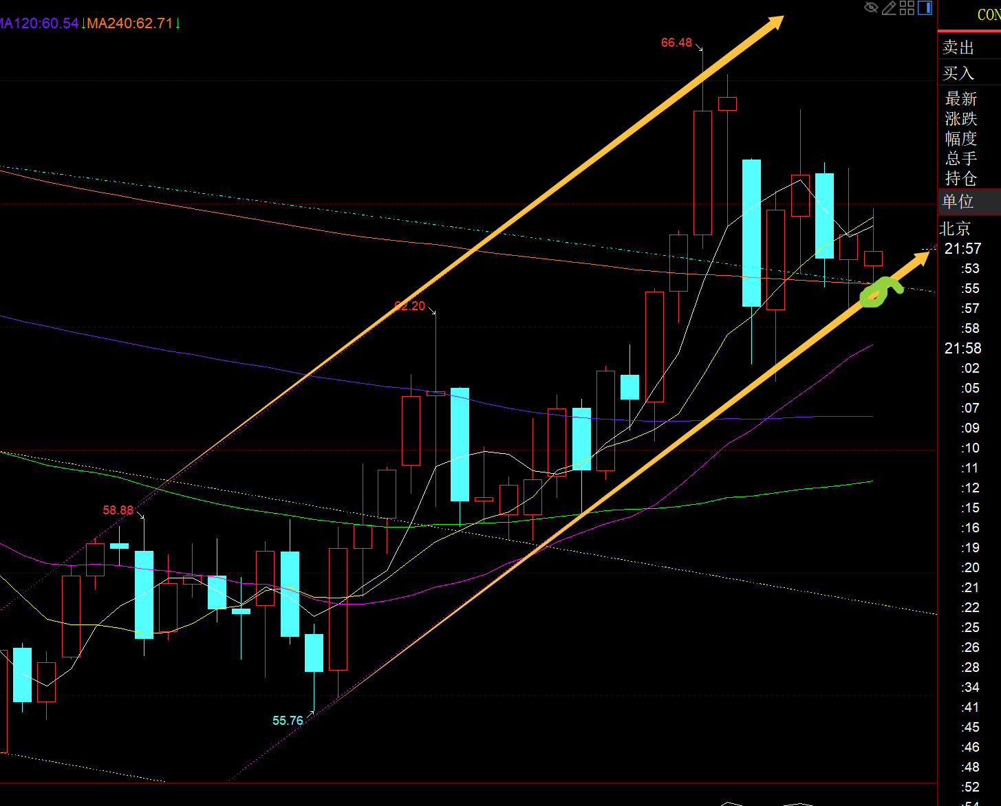 原油方面:周视频指出继续关注图中黄色通道下轨支撑62.5-62.7,守住它则还维持震荡反弹对待,日内是拉升了一波,最高63.9; 现在再次下滑,则反复震荡运行;若晚间二次触及支撑仍可尝试看反弹,破62则需调仓;
