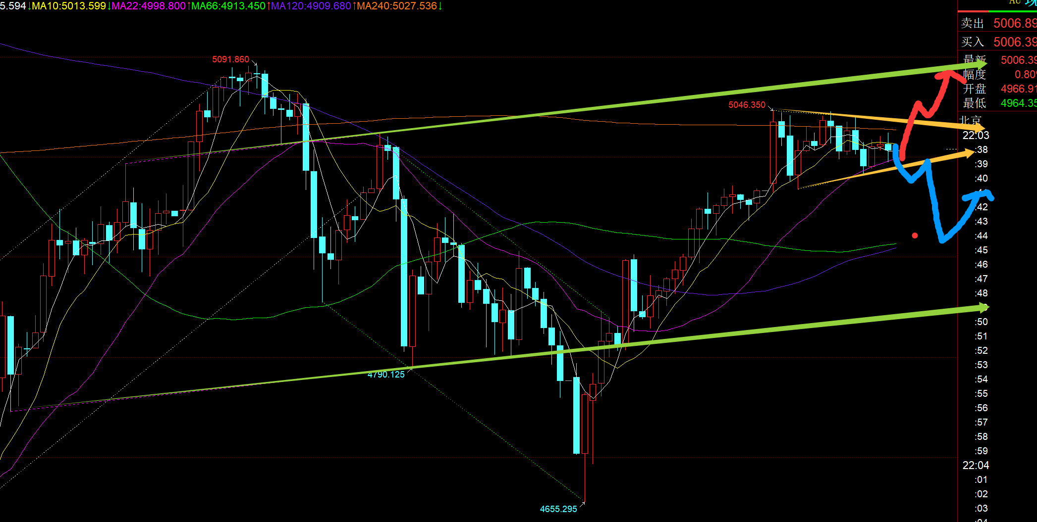 对于今晚来讲,早间依托4965直接先续涨一波,这点符合周视频预判,也抵达逼近5050目标阻力,而午后及欧盘,包括现在还处于相对高位反复整理,高点多次压制5040-5050,而低点稍有所上移,4965-4982,那么对应现在趋势支撑点大概4990附近,同时小时线中轨4995也是靠拢它,所以今晚4990上先企稳继续看北,阻力5025,突破站上继续看5040及上得失,能破新高的话,就有机会试探图中箱体通道的上轨5080-5090一线; 若守不住4990向下收大阴失守,则基本转为震荡,日线还要区间性反复整理,届时可择机反手看南,前者大概率,后者小概率,都做好预备心理;