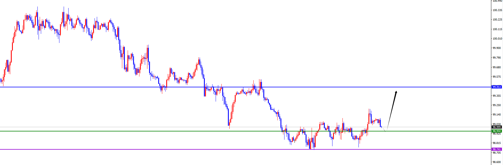 短线关键分水岭98.95区域,价格没有出现反转信号之前维持多
