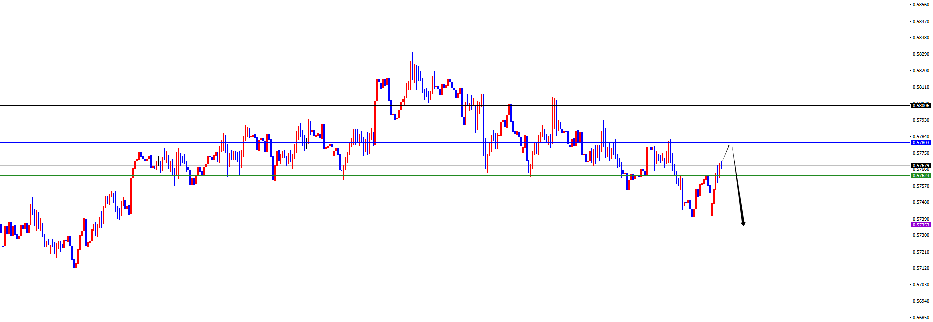 关键分水岭0.5770-80区域,价格反转信号之前维持空