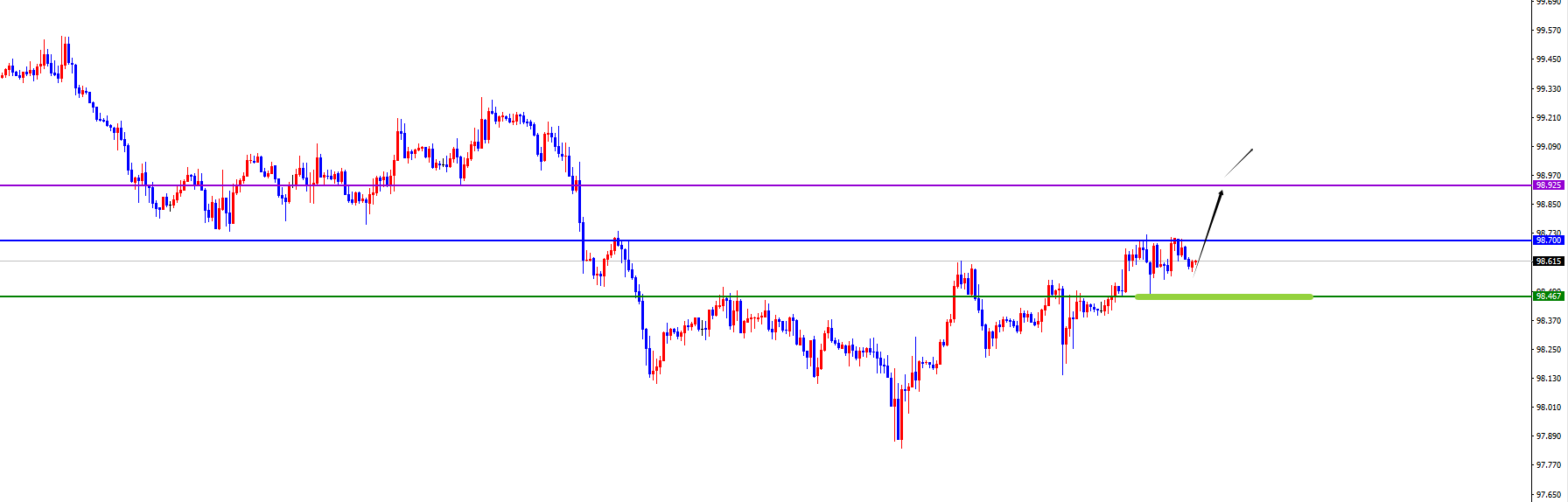 短线关键分水岭98.40-50区域,价格没有出现反转信号之前维持多