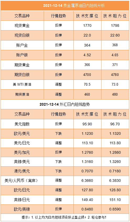 美元 对美元指数走势构成影响的因素有以下几个方面,首先,12月13日美国没有经济数据公布,市场进入期待美联储周三议息会议前的静默期。看似平静的市场,实在暗潮汹涌,资本市场美股周一三大指数全线下跌,道指跌320.04点,报35650.95点,跌幅0.89%;纳指跌217.32点,报15413.28点,跌幅1.39%;标普500指数跌43.05点,报4668.97点,跌幅0.91%。盘面上,大型科技股领跌,苹果高位回落,收跌2.07%,盘中市值一度逼近3万亿美元,亚马逊、谷歌-A、奈飞均跌超1%,微软跌近1%;半导体、汽车股全线走低,英伟达、通用汽车跌超6%,特斯拉跌近5%,福特汽车跌超4%。美股的这次下跌具有特殊的意义,尤其是面临周三美联储议息收紧宽松抽取流动性的不利影响,需要密切关注该因素对汇市和贵金属等市场等影响。其次,根据美国当地媒体周一发布的经济学家调查,眼下市场普遍预期美联储官员们周三议息会议将明确给出2022年加息的信号,同时加快缩减债券购买规模的速度。这项调查在今年12月3日至8日期间进行,参与调查的49名经济学家中有超过半数认为,18位FOMC委员的中位点阵图预期将达到明年两次加息。Macropolicy Perspectives经济学家Laura Rosner-Warburton接受媒体采访时表示,本周美联储将呈现史上向鹰派立场转向最大的点阵图。综合以上分析,市场对美联储收紧宽松会议感到紧张,金砖汇通近期判断的美元处在顶部调整走势不变,维持高位宽幅震荡走势到周四凌晨3点公布议息决议结果;再次期间汇市美元将继续调整,非美货币将承压下行调整。