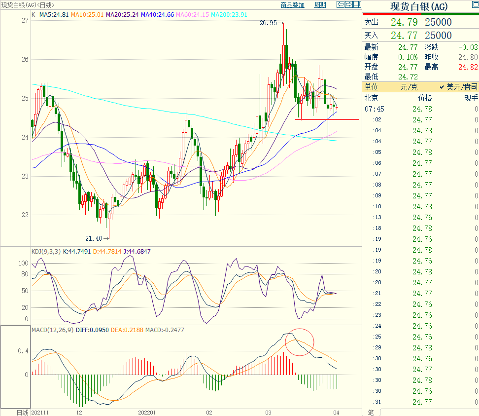银价从19.64/盎司附近大幅下跌回落,创出五年来的新低到11.29美元附近,随后价格一路反弹上行,两次上涨达到30美元后展开回落。目前整体价格在MA200下方运行,MACD指标企稳弱势震荡,60均线突破企稳打开上行空间延续上涨。近期关键支持是24.0美元,上方关键阻力27美元附近;日内短线有震荡向下的趋势。