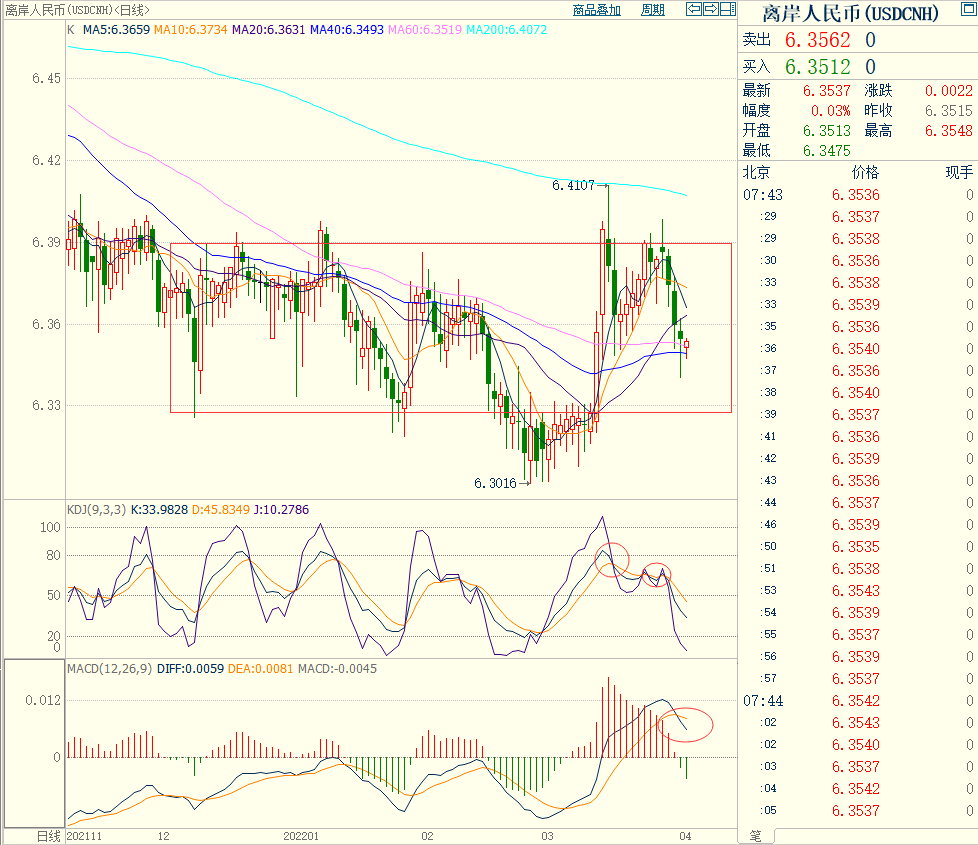 离岸价前期自2020年5月高位7.1964开启下跌走势,盘中跌破MA200均线的关键支持而下行走低;2021年5月触及6.3477点低位后开始震荡走高。2022年2月自6.3758开始回落走低,人民币相对美元继续升值,不过走势依然保持在6.3-6.4之间调整。当前行情日内震荡调整的趋势。