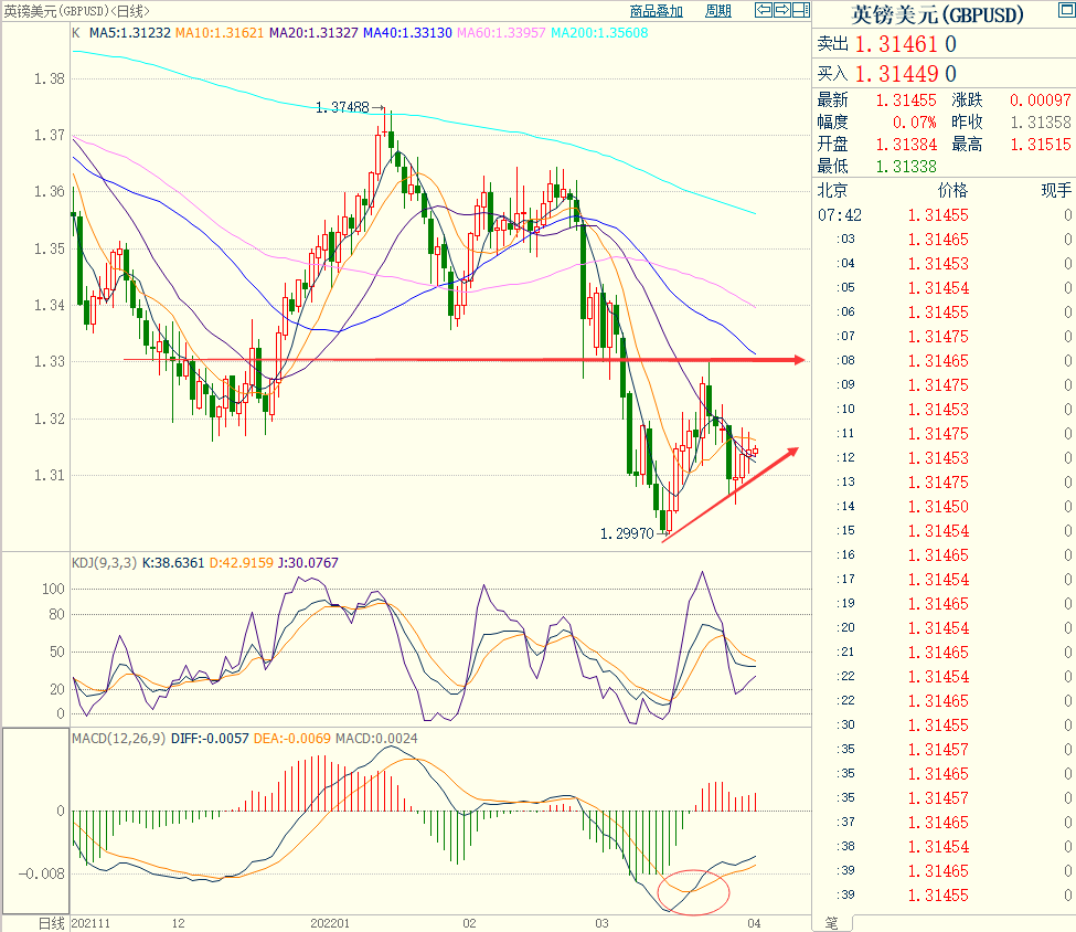 前期自2020年3月底企稳1.0635低点开启上涨走势;2021年1月触及1.23495点的高位后持续震荡下行。2021年11月跌破60周MA均线支持,中长期多空分水岭的支持跌破,行情处在回落调整的下行走势中。当前日内短线行情有下行震荡的趋势。