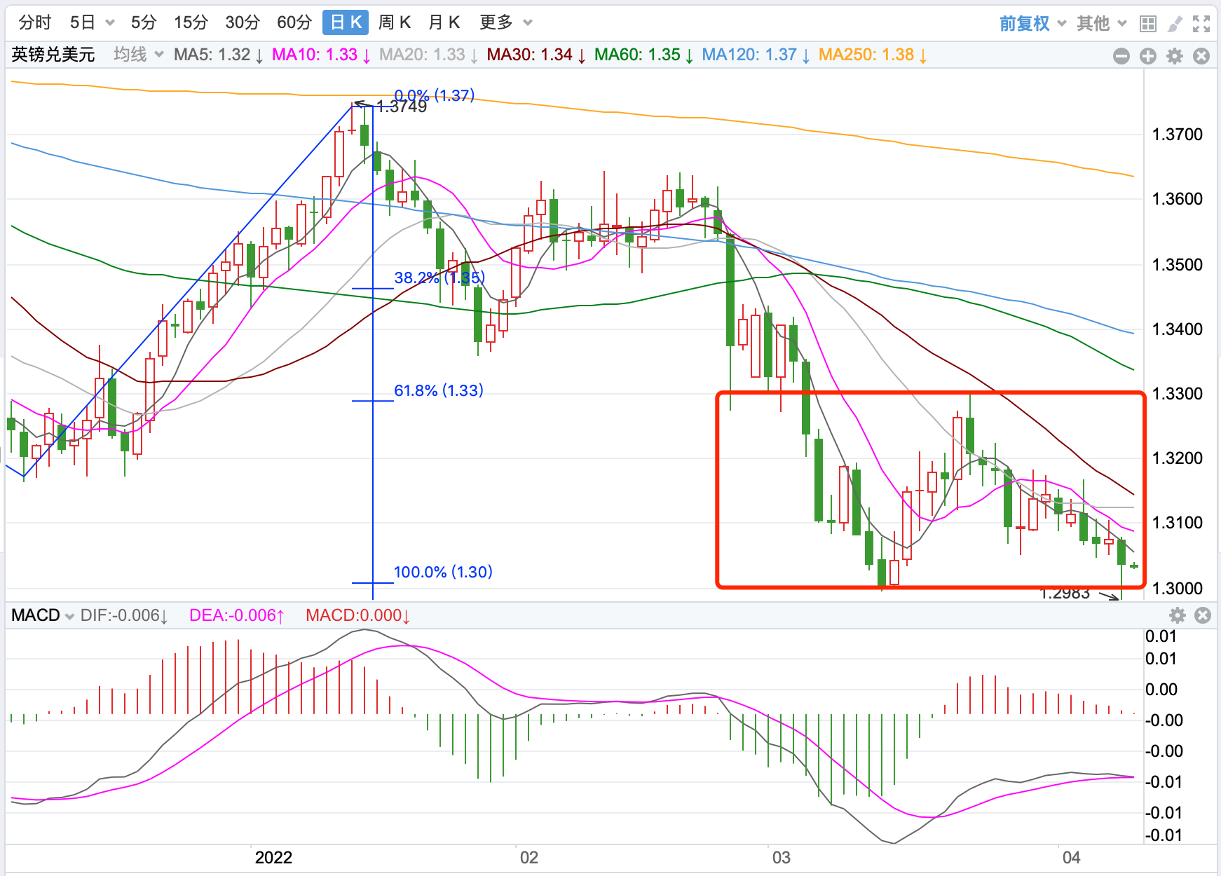 前期自2020年3月底企稳1.0635低点开启上涨走势;2021年1月触及1.23495点的高位后持续震荡下行。2021年11月跌破60周MA均线支持,中长期多空分水岭的支持跌破,行情处在回落调整的下行走势中。当前日内短线行情有下行震荡的趋势。