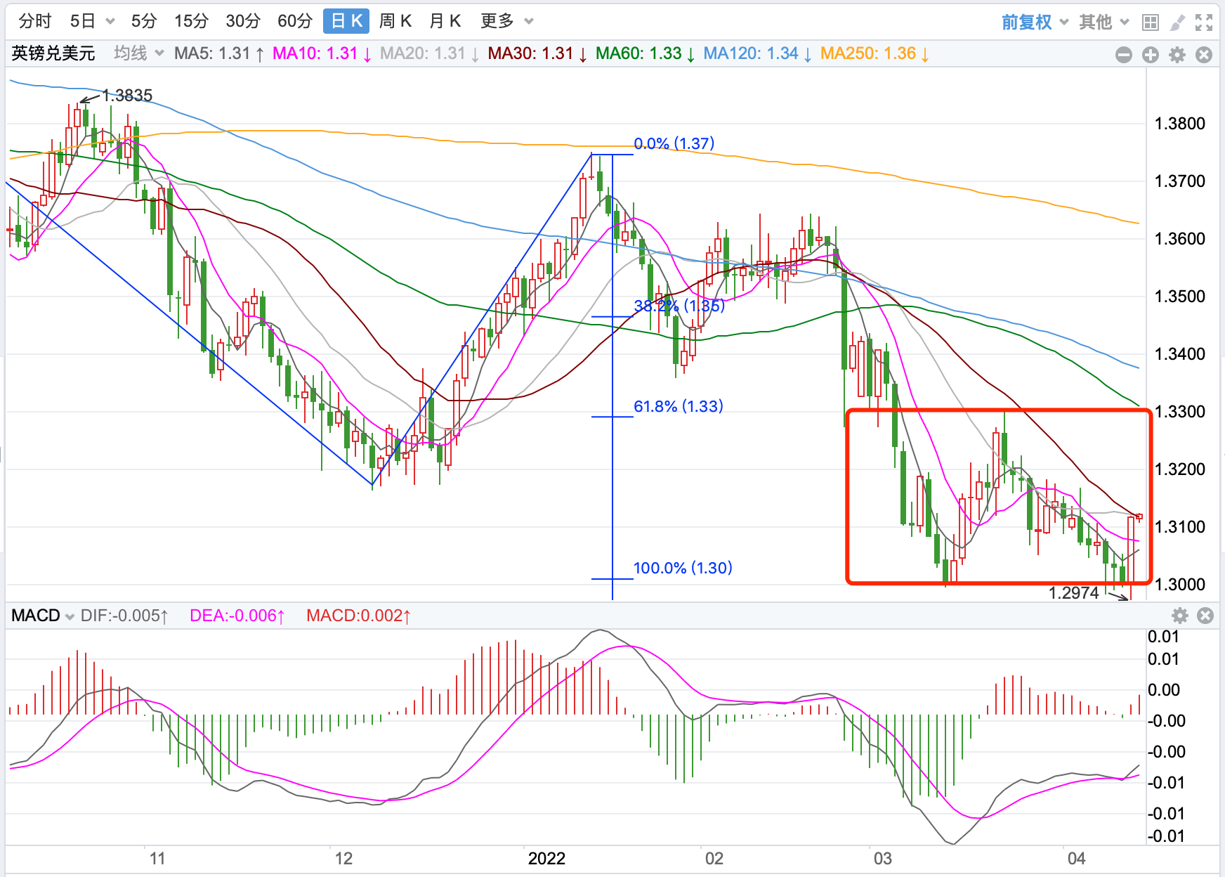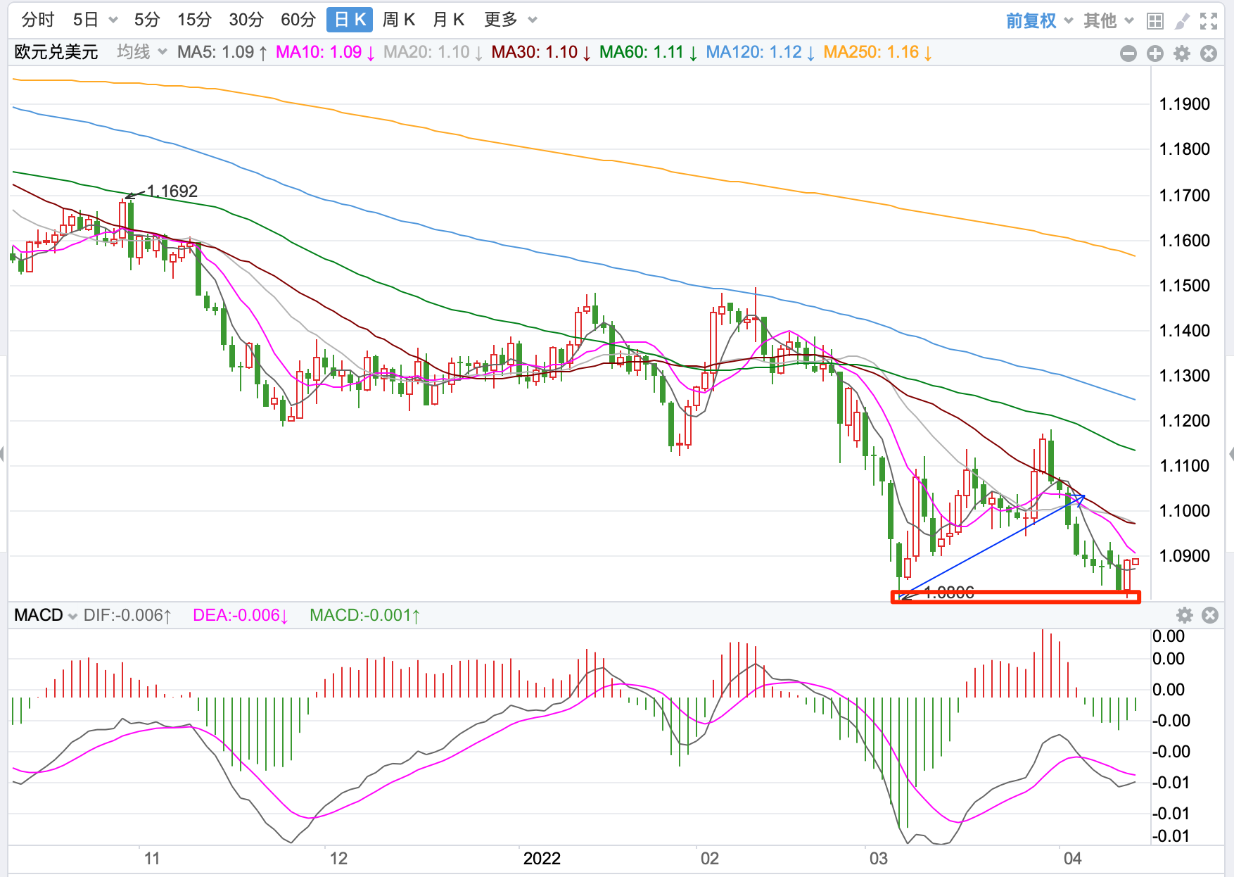 前期自2020年3月底企稳1.0635低点开启上涨走势;2021年1月触及1.23495点的高位后持续震荡下行。2021年11月跌破60周MA均线支持,中长期多空分水岭的支持跌破,行情处在回落调整的下行走势中。当前日内短线行情反弹向上的趋势。
