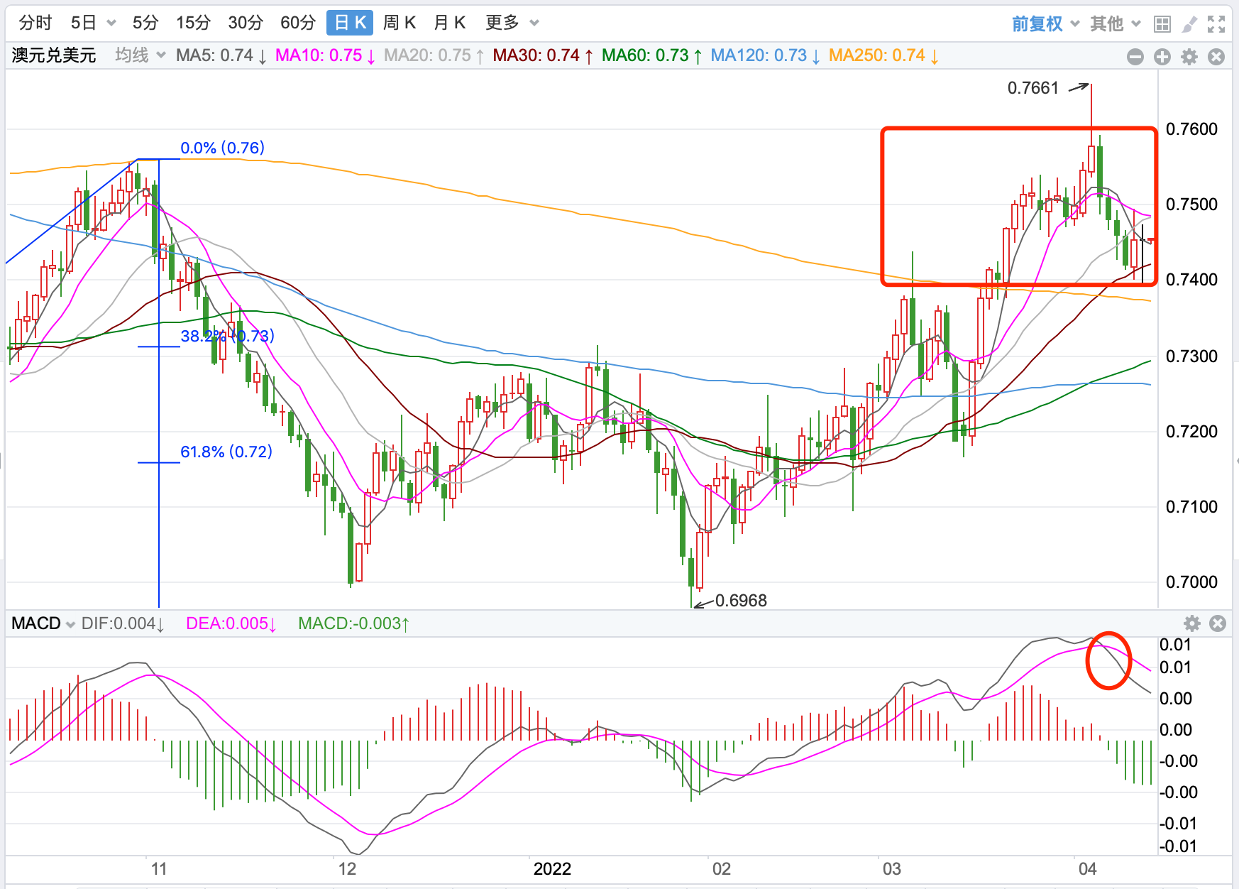 前期自2020年3月底企稳0.5673低点开启上涨走势;盘中突破了MA200均线的关键阻力而上行走高;2021年2月触及0.80072点高位后开始震荡走低,8月底企稳在0.7114点展开反弹走势再度终结,目前反弹依然在延续。当前日内短线反弹调整的趋势。