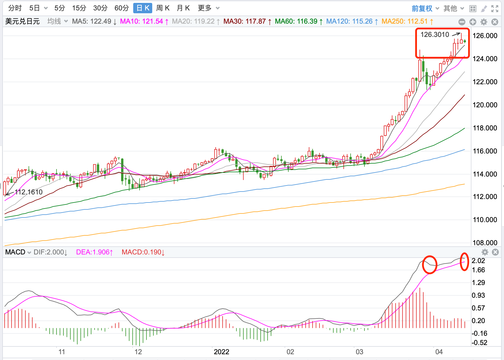 美元指数前期持续上涨在2020年3月份创出102.99点的高位后一路震荡回落走低,2021年1月份触及89.206点的低位后,开始向上持续震荡走高;2021年11月份指数突破MA60周线后保持其上运行,此后打开了中长期上升的空间。中期指数站稳中期走势的支持上运行;当前日内短线行情冲高回落调整的趋势。