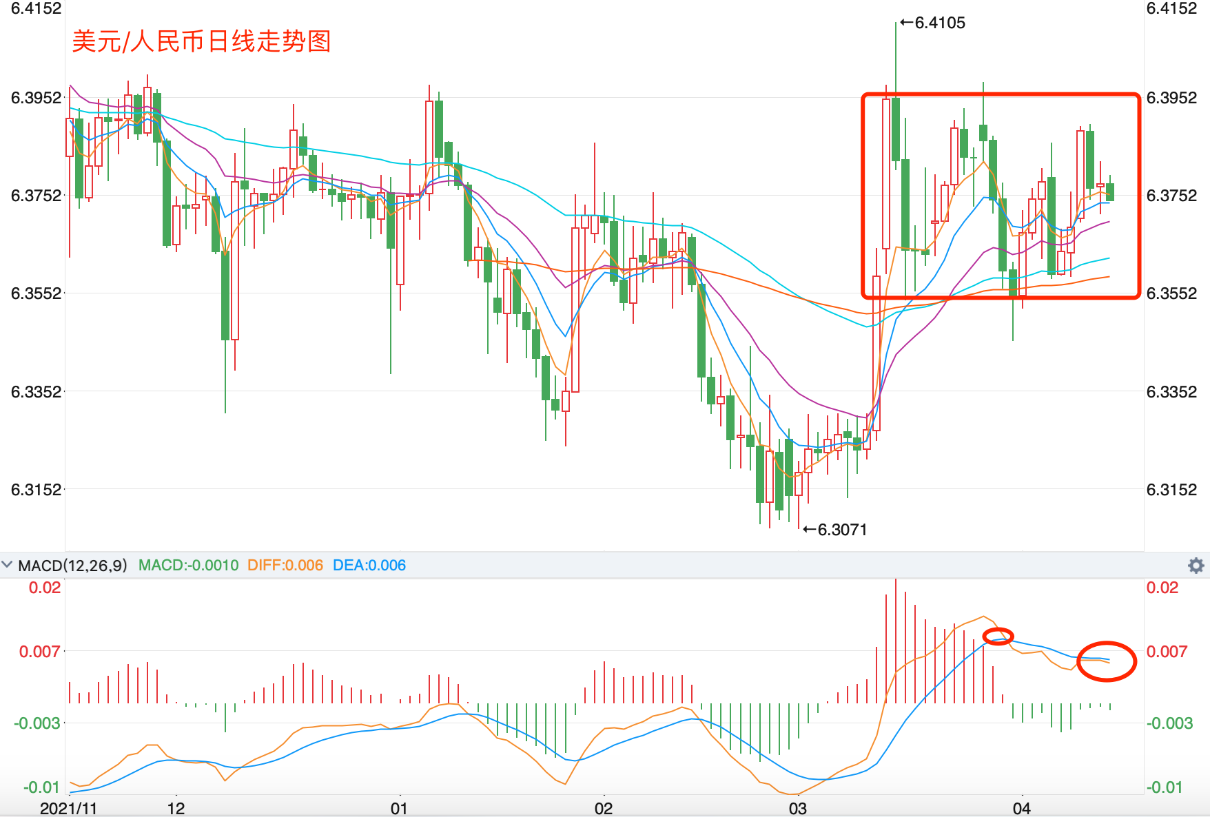 离岸价前期自2020年5月高位7.1964开启下跌走势,盘中跌破MA200均线的关键支持而下行走低;2021年5月触及6.3477点低位后开始震荡走高。2022年2月自6.3758开始回落走低,人民币相对美元继续升值,不过走势依然保持在6.33-6.40之间调整。当前行情日内震荡下跌趋势。