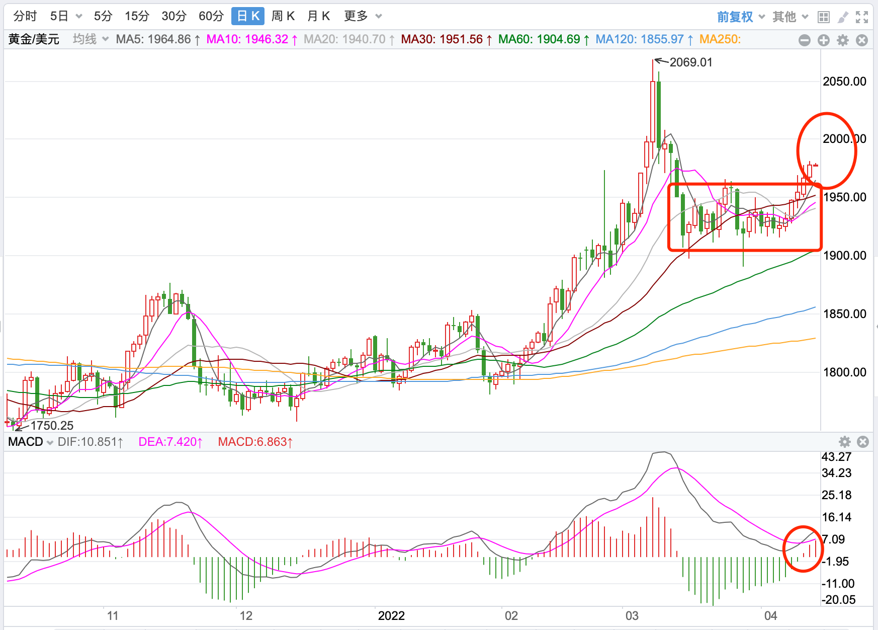 金价从1445美元/盎司的前期低点一路展开上行,创出之前2075的新高后,先回落后持续震荡下跌达到15个多月。当前整体价格在MA200上下运行,MACD指标弱势震荡,形成触底反弹的走势。近期短线1960美元是多头关键的支持,上方阻力2000美元。日内短线有继续向上调整的趋势。