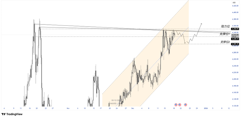 在年末全球市场风险情绪再度升温的背景下,国际金价持续走强,现货黄金一度上探至4348美元上方,逼近历史高点区域。此轮上涨并非单一因素推动,而是由美国经济数据转弱、美联储降息预期回暖以及地缘政治风险骤然升温共同催化,令黄金的避险与抗通胀属性再次成为市场焦点。