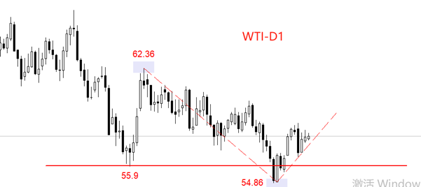 行情方面,日线级别,美原油WTI处于重心不断下移的横盘震荡状态。震荡状态在今年4月份就已经开始,底部支撑区域在55美元附近。中期高点为图中62.36美元,中期低点为图中54.86美元,最新的上涨波段正在形成新的中期高点。经过半年多的重心下移后,美原油报价已经非常接近底部区域。最新市价57.9美元,底部区域55美元。如果最新上涨波动不能突破62.36的中期高点,未来有可能再次启动下跌走势,并严重威胁55美元的支撑作用。