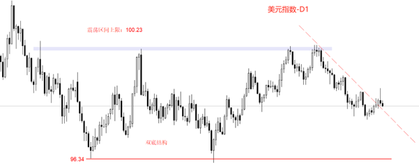 行情方面,美元指数依旧在下跌寻底。2025年7月1日,美元指数触及阶段性低点96.34点,该点位在随后数月的行情发展中被证明是重要的支撑位。过去半年左右的时间,美元指数通过两轮显著的反弹,确定了阶段性高点和强阻力位100.23点。目前美元指数稳定的运行在震荡区间(96.34~100.23)内部。2025年11月21日至今的下跌波段,受到图中下降趋势线(虚线)的显著,最终落点可能在震荡区间下限附近。上周四、五两日的阳K线上穿下降趋势线,行情存在调整下降跌势的可能。但昨日的长上影阴K线,打破了这种预期。如果今日K线继续收阴,跌势可能将延续。