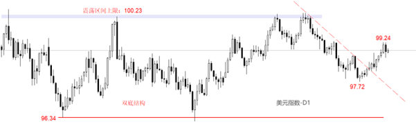 行情方面,美元指数保持中期的横盘震荡态势,下限96.34,上限100.23点。11月21日至12月24日是新一轮震荡区间内的下跌,最低触及97.72点,距离下限仍有一段距离。12月25日以后,美元指数开始中短期反弹走势,目前最高价触及99.24,逼近100整数关口。昨日K线呈现出大波动率、中下影线的阴K线,有短期触顶迹象。如果今日继续收阴线,中短期反弹波段可能宣告终结。
