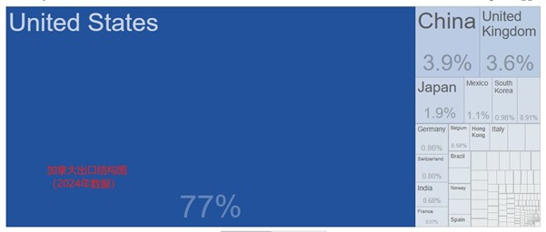 加拿大经济严重依赖对美国的出口,但美国持续提高加拿大的进口关税和限制。2024年加拿大出口总值5496.2亿美元,其中77%出口流向美国。如此单一的出口结构,注定加拿大难以承受来自美国的贸易壁垒。