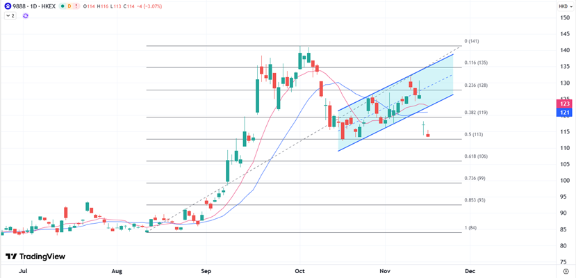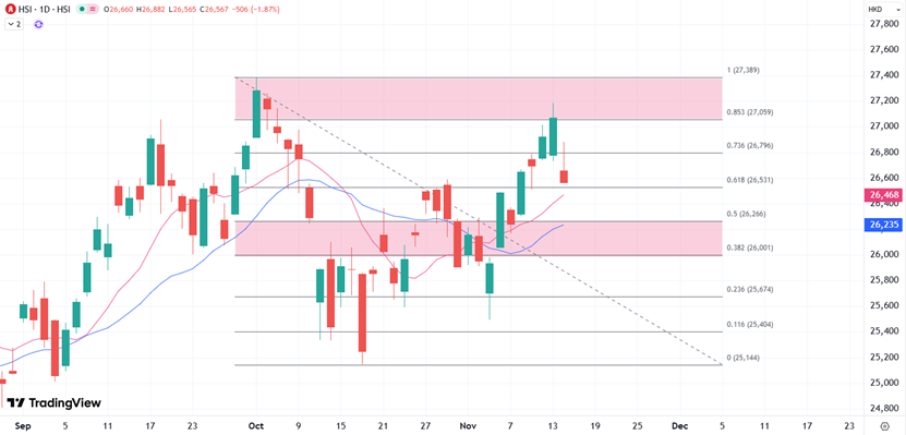ATFX:港股四日连涨后迎来回吐,26000关口或再次发挥重要支撑 ATFX:港股四连升累涨831点后今日受压,再跌穿两万七关口。恒指中午收报26732点,跌340点。国指跌132点或1.4%,报9,466点;恒生科技指数跌131点或2.2%,报5,849点。午后初段恒指在科技股拖累下跌幅再度扩大至超过400点。关注下方日图主要均线对于26000关口的