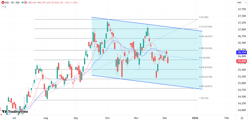 ATFX:港股连涨后回吐:失守26000关口聚焦区间低位支撑 恒指今早低开114点后,半日跌252点或0.97%,报25843点。国指跌115点或1.3%,报9,067点;恒生科技指数跌72点或1.3%,报5,551点。港股午后续回吐,跌势扩大至约300点。 科网股持续弱势,网易(09999)跌2.9%;快手(01024)跌2.3%;阿里巴巴(09988)跌2%;腾讯(00700)跌1