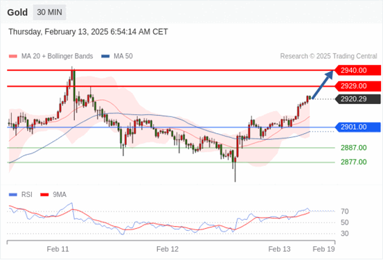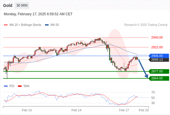 查看交易中心全球研究部门今日的市场观点。从受欢迎的交易产品中探索新的交易方法与机会。 欧元/美元黄金现货英镑/美元欧元/日元欧元/英镑美元/瑞郎德国DAX指数期货(urx)布伦特原油(IC)英国富时100指数期货 黄金现货当日内:短期关键阻力位在2906.00。 转折点: 2906.00 交易策略: 在2906.00之下,看跌,目标价位为2