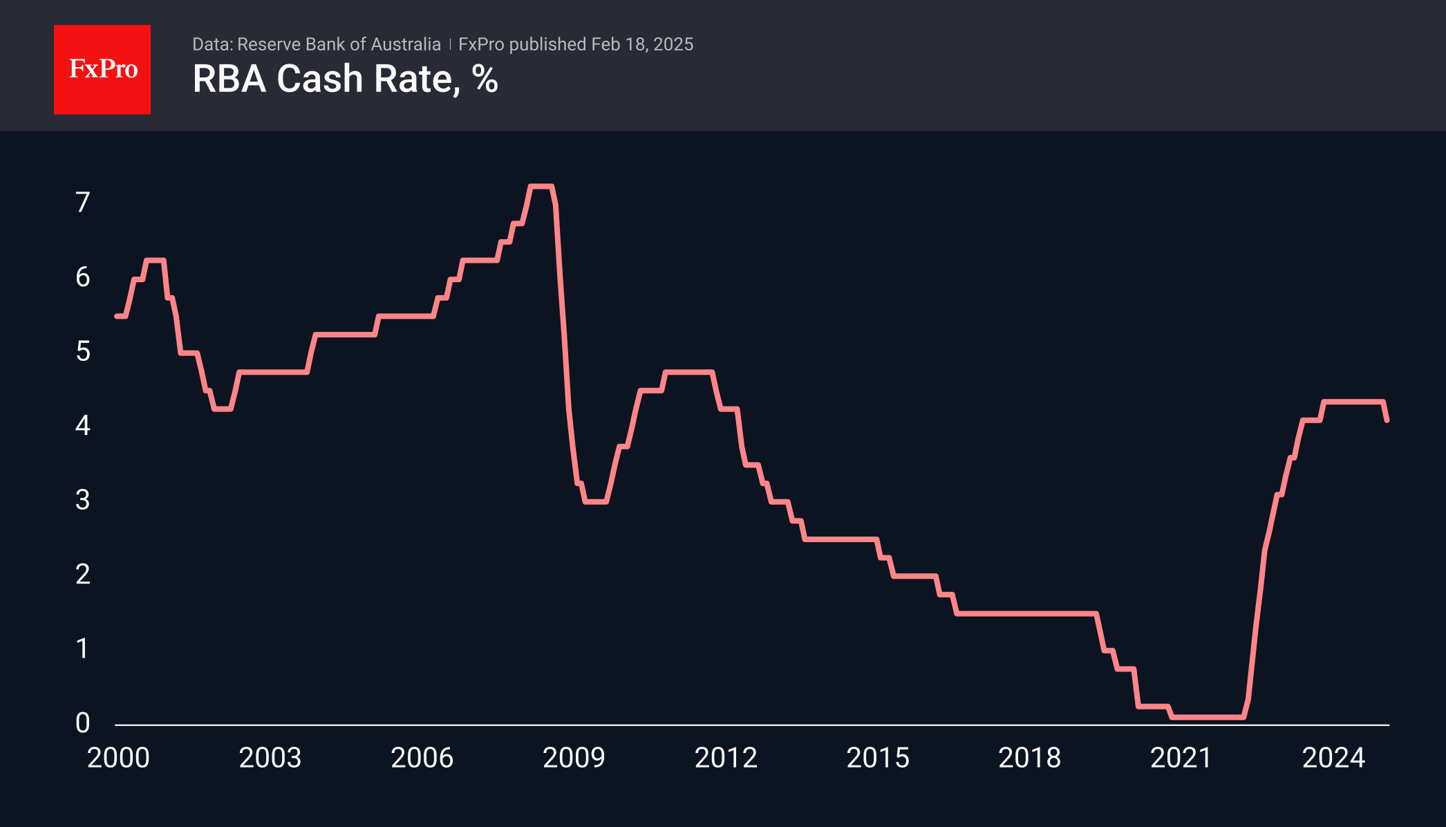 注:此文章由Fxro高级分析师AlxKutikvich撰写 澳大利亚储备银行将关键利率下调25个基点至4.1%,符合市场参与者的预期,并开启了货币宽松周期。上一次降息是在2020年11月且加息周期始于2022年5月。 澳大利亚央行达到预期,加入多数央行放松政策以应对低通胀率,但评论听起来比预期更强硬。这一决策评论指出,在一系列意