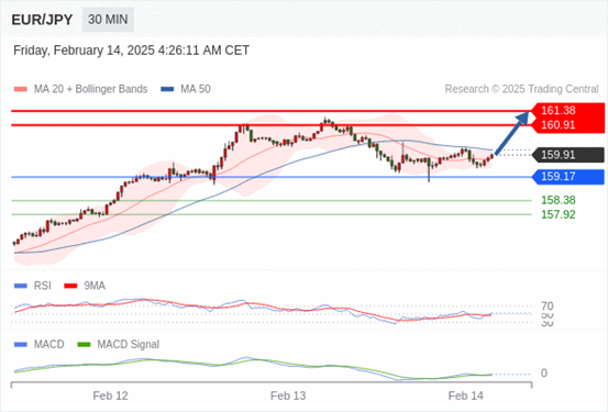 欧元/日元 当日内: 看涨。