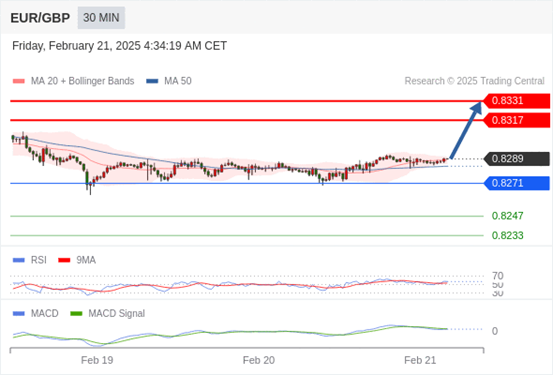 欧元/英镑 当日内: 看涨,当 0.8271 为支撑位,目标定在0.8331。